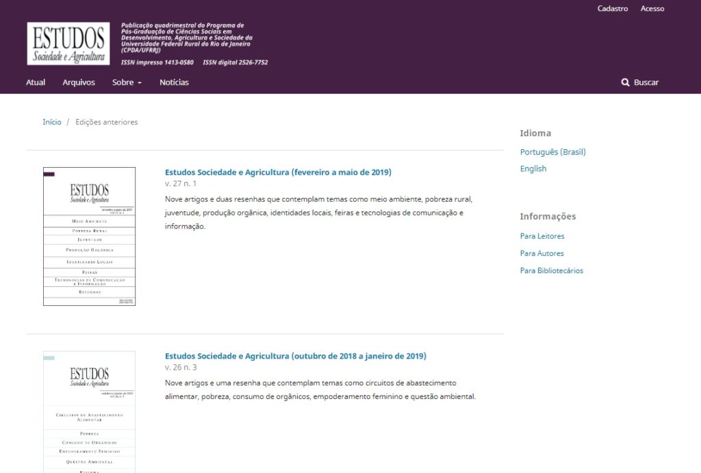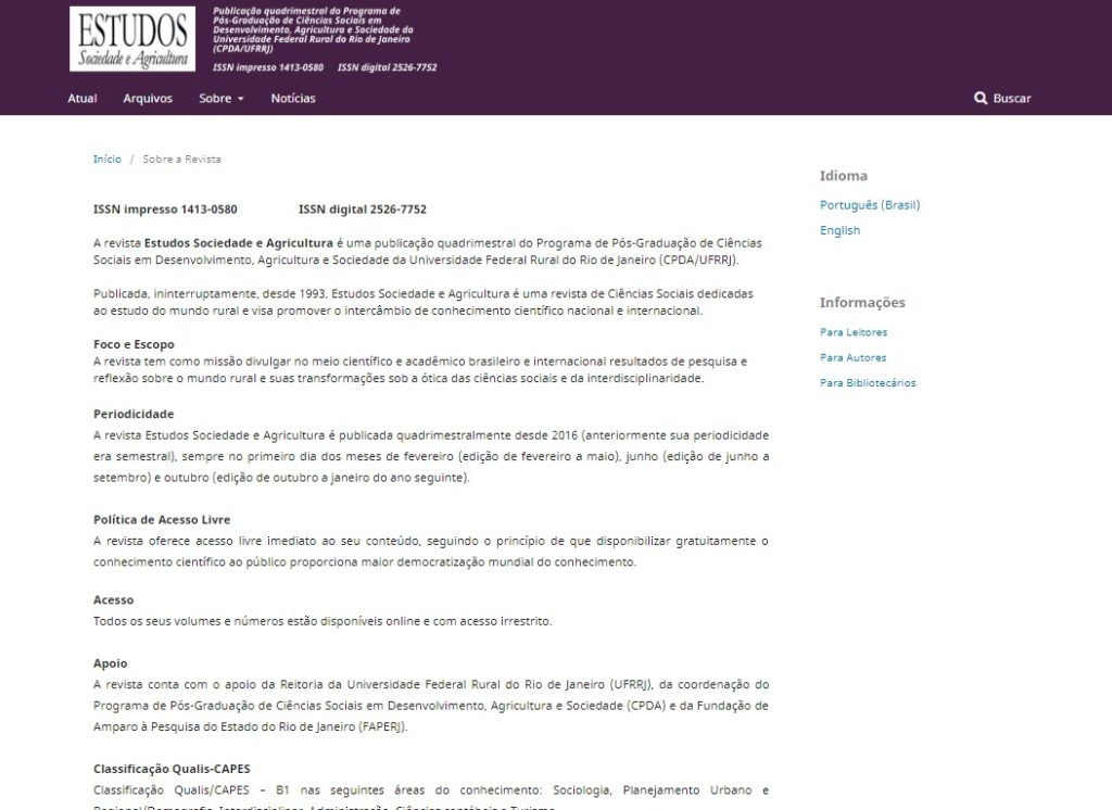 Publicada, ininterruptamente, desde 1993, Estudos Sociedade e Agricultura é uma revista quadrimestral (desde 2016) que visa promover o intercâmbio de conhecimento científico nacional e internacional.